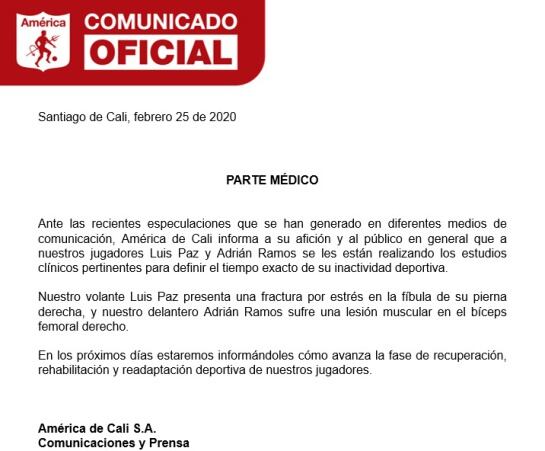 América de Cali tendría tres importantes bajas en su formación titular para afrontar el clásico de este sábado en cumplimiento de la fecha 7 de la liga colombiana. El departamento de la institución escarlata dio a conocer a través de un comunicado la situación clínica de los jugadores Luis Paz y Adrián Ramos, quienes se unen al capitán y defensa central Juan Pablo Segovia quien sobre 20 minutos de juego en el partido ante Independiente Santa Fe en Bogotá, debió ser sustituido por un fuerte golpe recibido a la altura de su cadera.
