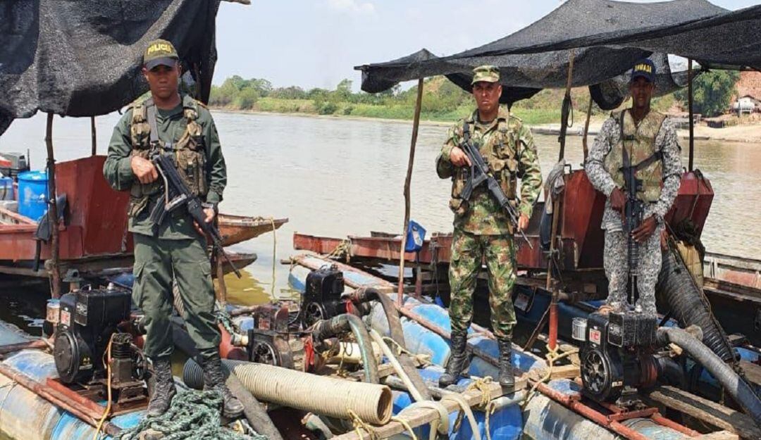 Tropas de la Armada de Colombia, en una operación conjunta y coordinada con el Ejército Nacional y la Policía Nacional, lograron la captura de once personas y la incautación de dos dragas artesanales utilizadas para la explotación ilícita de yacimientos mineros en el río Cauca, en el área general del municipio de Guaranda, en el departamento de Sucre.