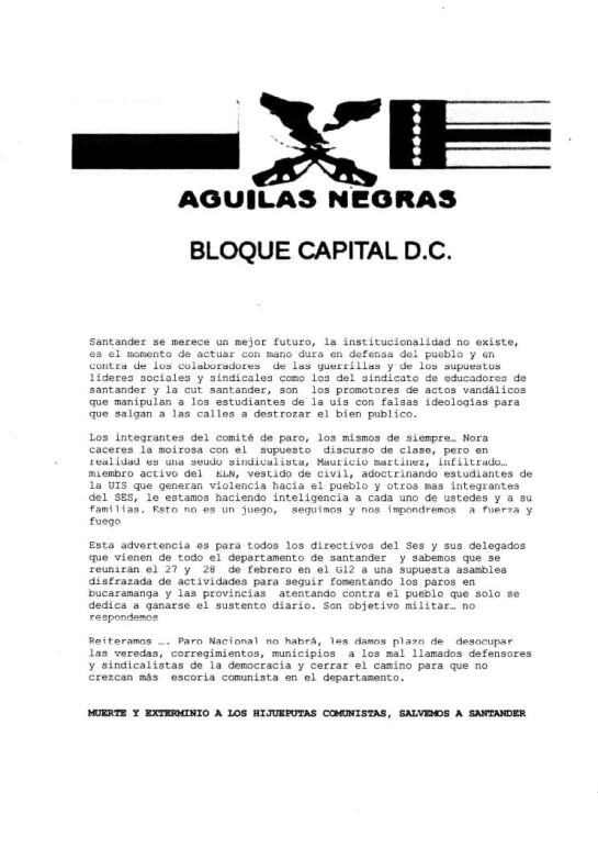 Bajo el nombre de las Águilas Negras más de una decena de educadores de Santander recibieron amenazas de muerte contra ellos y sus familias.