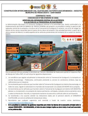 2. Se recomienda que los vehículos que transiten sobre la Transversal de Guatiguará con destino Bucaramanga, en todos los casos, regulen la velocidad en la maniobra de incorporación a la calzada SUR-NORTE de la autopista.