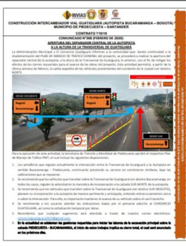 4. Se recomienda a los usuarios atender las indicaciones dadas por el personal adscrito al CONSORCIO GUATIGUARÁ, así como la señalización temporal por obras.