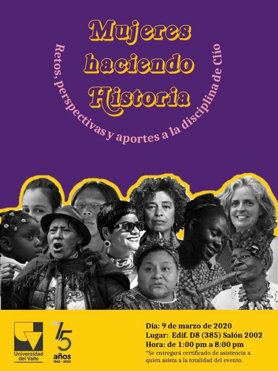 Para el lunes 9 de marzo la invitación académica es por parte del Departamento de Historia de la Facultad de Humanidades de la Universidad del Valle con el evento "Mujeres haciendo Historia. Retos, perspectivas y aportes a la disciplina de Clío", el cual quiere resaltar el papel de la mujer en las Ciencias Sociales.
