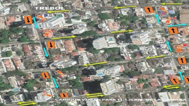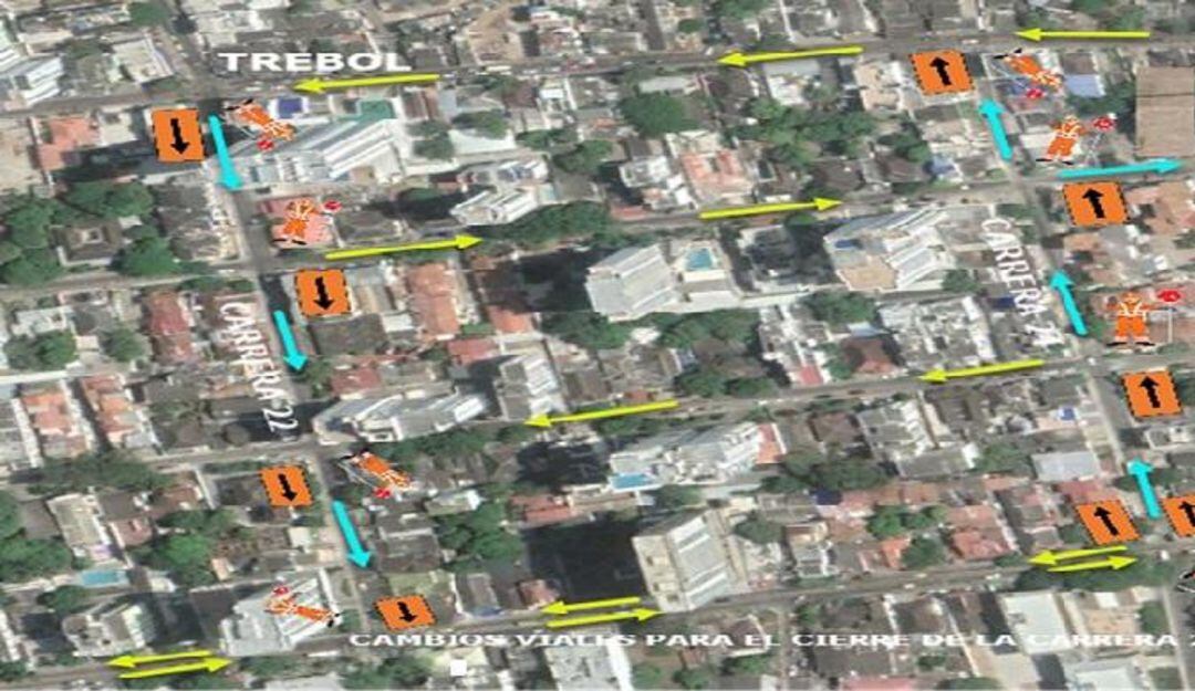 Para los vehículos que transitan por la calle 26 (avenida Jiménez) hacia la cuarta avenida, el desvío es por la carrera 24(contraflujo), y para los vehículos que ingresan por la cuarta avenida hacia la calle 26, el desvío es por la carrera 22(calle de la Asamblea) la cual sólo quedará en sentido hacia la avenida Jiménez.