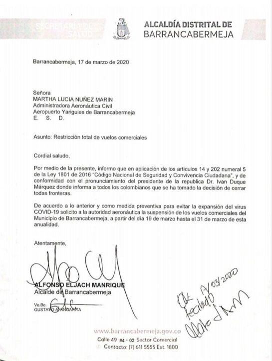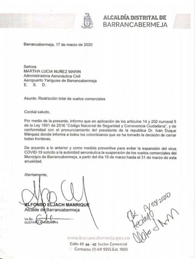 "De conformidad con el pronunciamiento del presidente de la república Iván Duque donde informa a todos los colombianos que se ha tomado la decisión de cerrar todas las fronteras, (...) como medida preventiva para evitar la expansión del virus Covid-19, solicito a la autoridad Aeronáutica Civil la suspensión de los vuelos comerciales de Barrancabermeja a partir del 19 de marzo hasta el 31 de marzo de esta anualidad", se lee en la misiva.