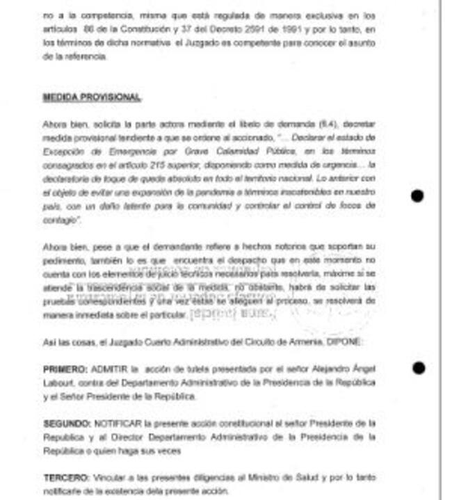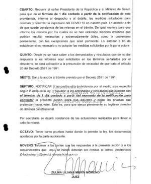 En la aceptación de la tutela el juzgado además solicitó al presidente que informe porque no se ha decretado la cuarentena permanente, además la admisión de la tutela vincula al ministerio de salud.