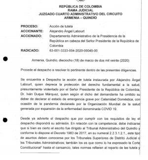 La acción judicial fue aceptada por el juzgado cuarto administrativo del circuito de Armenia que le dio un día al presidente de la república para que informe al despacho sobre las medidas tomadas para enfrentar esta pandemia.