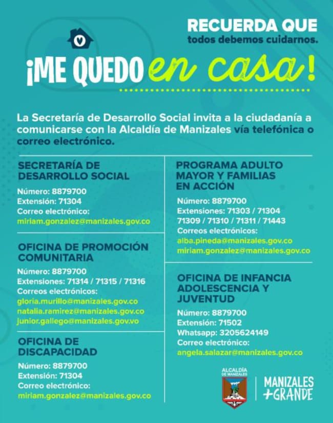 Líneas de atención de comunidades vulnerables por el toque de queda / Cortesía: Secretaría de Desarrollo social de Manizales