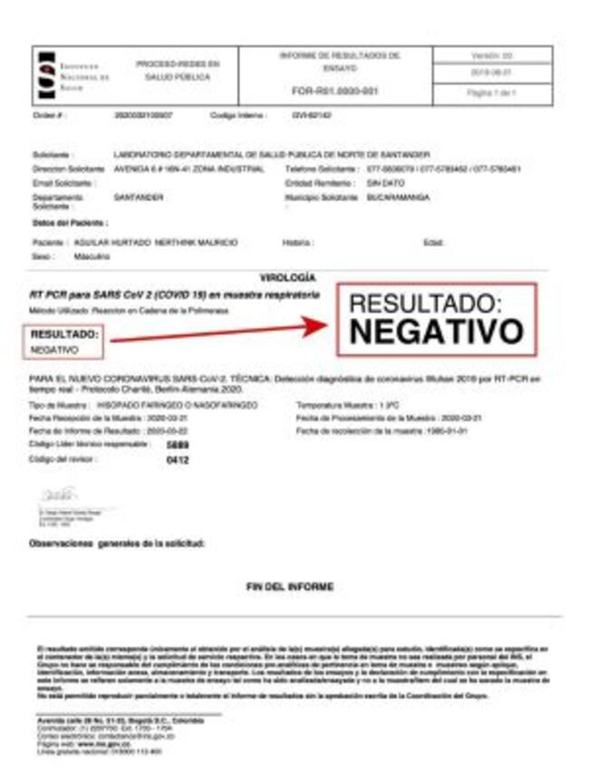 A través de su cuenta de twitter, el gobernador de Santander Mauricio Aguilar confirmó que la prueba que le realizaron hace dos días para saber si tenía coronavirus, le fue entregada hoy con un resultado negativo.