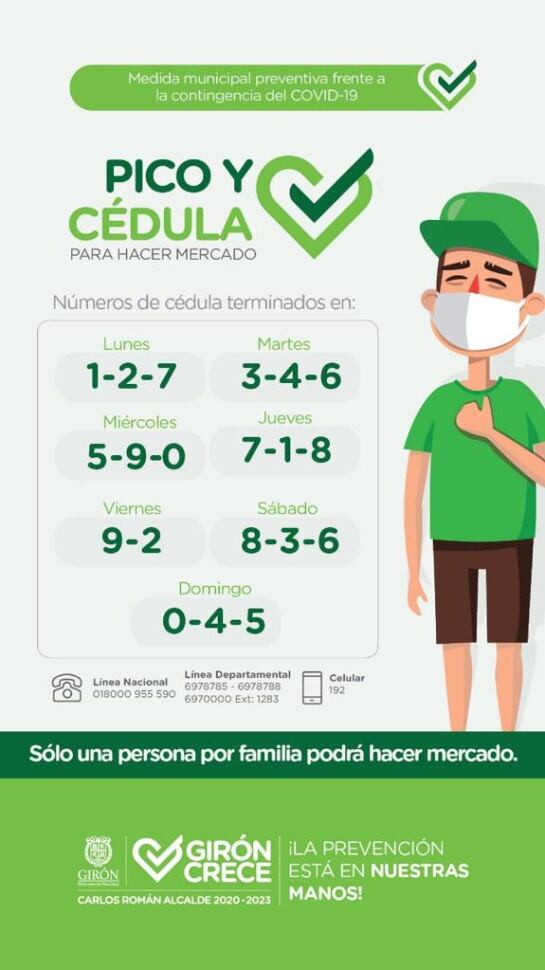 El alcalde de Girón Carlos Román informó que desde este lunes festivo empezará en el municipio pico y cédula para mercar.