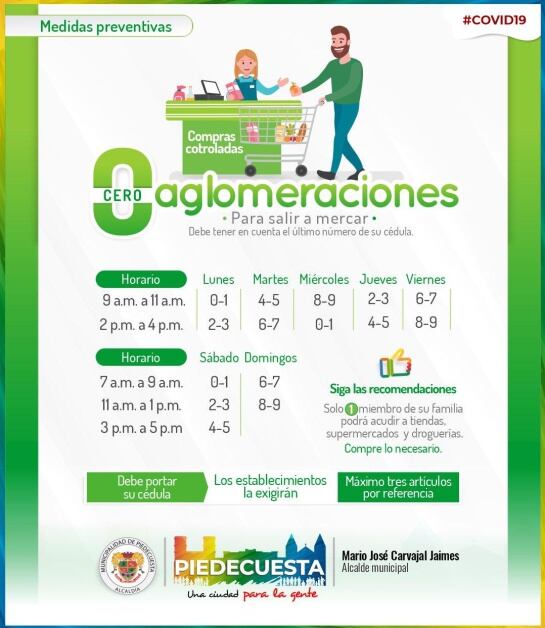 En el caso de Piedecuesta se presenta una novedad porque en este municipio la salida de compras se hará por horas, es decir que los lunes de 9:00 a 11:00 de la mañana cédulas terminadas en 0 y 1 y de 2:00 a 4:00 de la tarde, cédulas terminadas en 2 y 3,podrán hacer mercado.