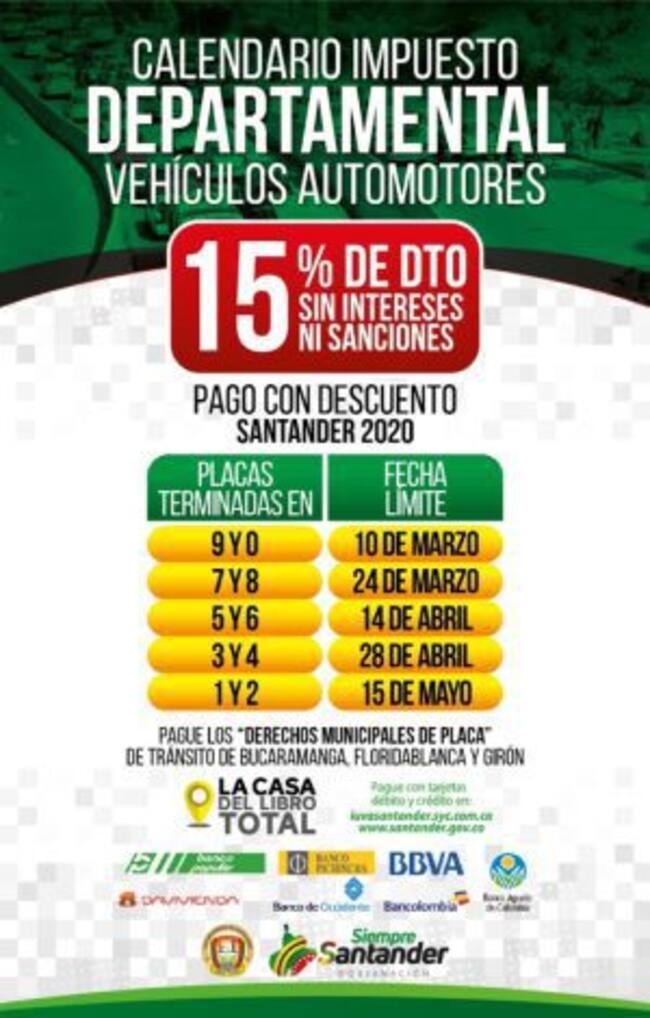 Es decir que los santandereanos tendrán 60 días más de plazo para pagar con el 15% de descuento esta obligación. Precisamente hoy martes de 24 de marzo era el último día para las placas terminadas en 7 y 8.