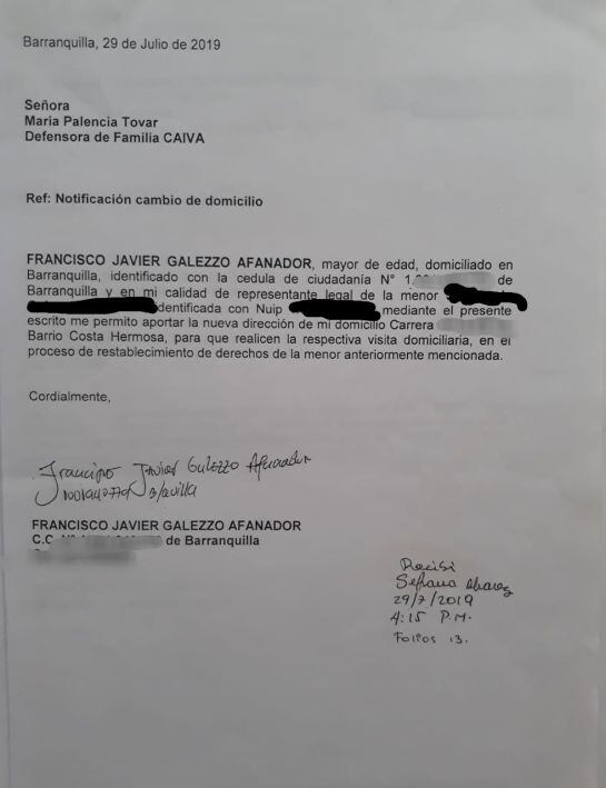 Ante esto, Fracisco Galezzo, indicó que es incierta esta afirmación de la mujer, teniendo en cuenta, que el Comisario de Familia envió a la menor al nuevo domicilio que él tiene.