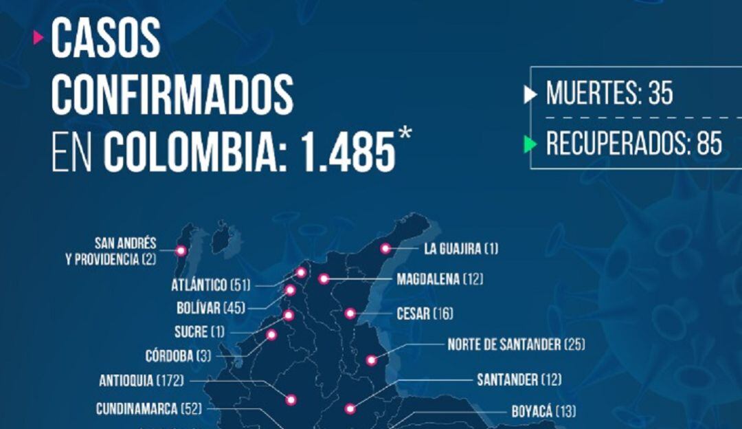 Este domingo 5 de abril del 2020, el Ministerio de Salud confirmó 79 nuevos casos de Covid-19 en Colombia, elevando así su cifra a 1.485 personas infectadas.