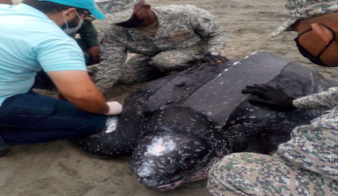 El ejemplar encontrado en el sector de La Rada, en el municipio de Moñitos, es un espécimen que mide aproximadamente dos metros de largo, y tiene un peso aproximado de 420 kilos, por lo que, de manera conjunta con la Policía Ambiental, la Armada Nacional y la comunidad del sector Bahía La Rada, se procedió a la atención médico-veterinaria bajo el asesoramiento de expertos veterinarios del Centro de Centro de Atención y Valoración de Fauna Silvestre (CAV) de la CVS.