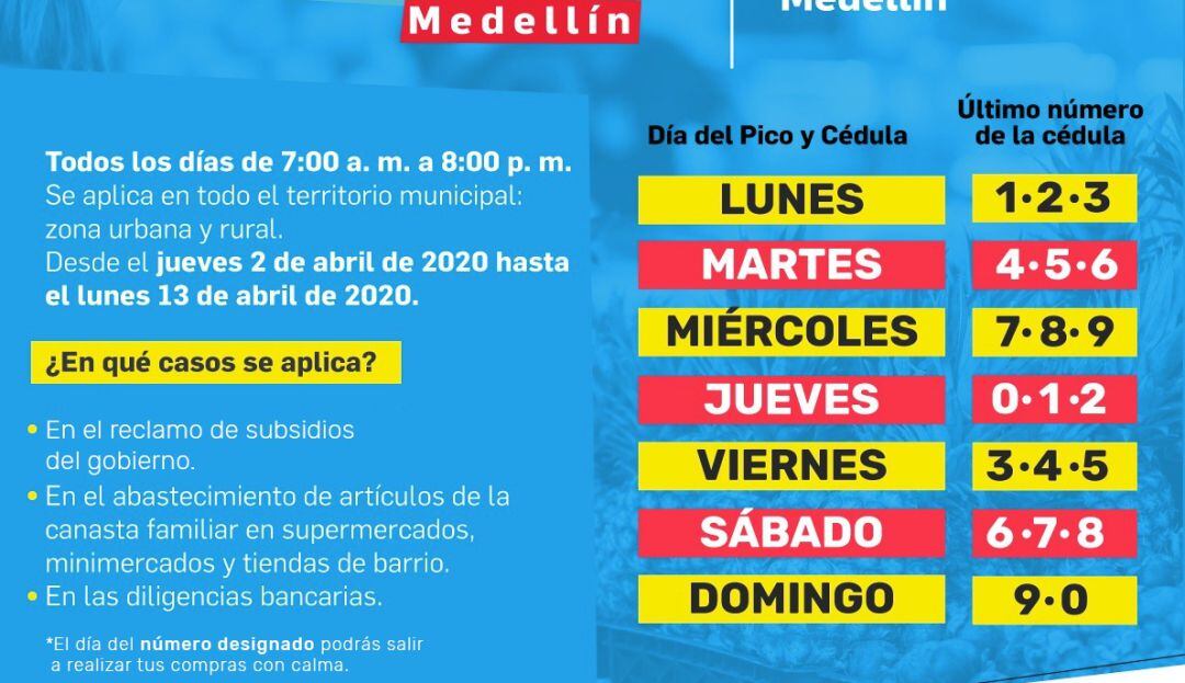 Según el alcalde de Medellín Daniel Quintero, esta medida se hace con el fide salvaguardar la salud de los habitantes y para que de manera ordenada se puedan abastecer. La medida permitirá que un solo integrantes de cada familia pueda salir dos veces a la semana a realizar las actividades permitidas por el decreto de cuarentena obligatoria decretada por el gobierno nacional.