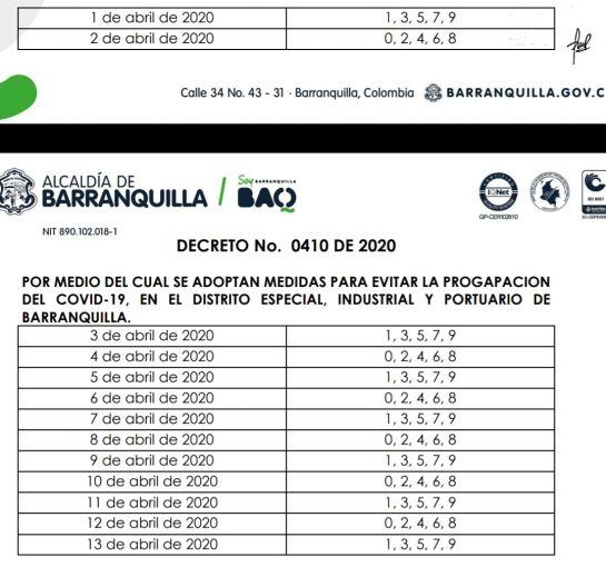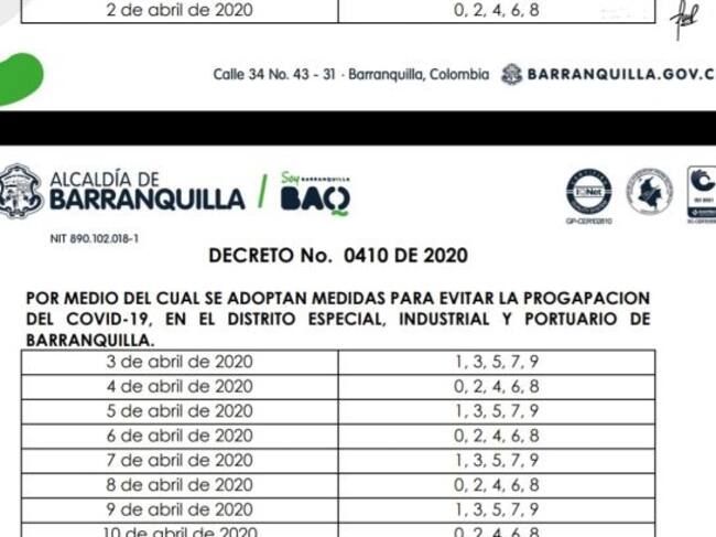 El mandatario Jaime Pumarejo indicó que los barranquilleros podrán salir los días pares cuando sus cédulas terminen en un número par y cuando termine en impar los días impares. El funcionario dijo que exceptúan aquellas actividades que están contemplas en la ley como ir a trabajar o una cita médica.