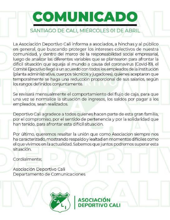 Los dirigentes, jugadores y cuerpo técnico del Deportivo Cali, acordaron rebajar los sueldos de manera temporal mientras se atraviesa por la crisis del Covid 19, el presidente Marco Caicedo, manifestó gratitud por la solidaridad de todos.