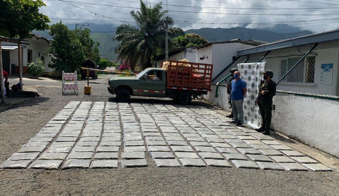 El vehículo tipo camioneta de estacas fue detenida en el sitio Santa Ana por donde pese a las restricciones de movilidad el individuo pretendió llegar a la ciudad de Cali con la droga.