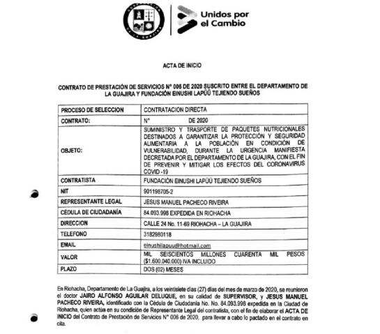 Mientras tanto, la Gobernación de La Guajira, también firmó un contrato a través de contratación directa para entregar kits alimentarios en todo el departamento por un valor de $1.600.040.000.