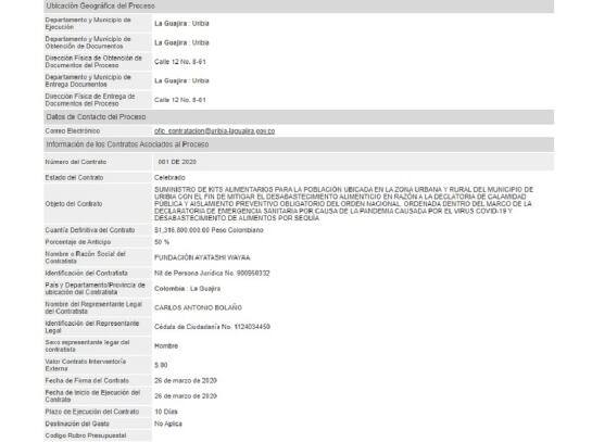 En Uribia, municipio de La Guajira, se firmó un contrato el pasado 26 de marzo con la fundación Ayatashi Wayya en donde se entregarán 8.000 mercados, en un plazo de 10 días, cada uno tiene un costo de 164.600 pesos, es decir, el contrato es más de 1.300 millones de pesos.