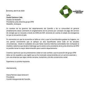 La líder gremial le solicita al presidente de la Junta directiva del grupo EPM, Daniel Quintero a la cual pertenece la Empresa de Energía del Quindío, Edeq que entendiendo que la fijación de las tarifas es regulada por la CREG es necesaria congelar más mismas mientras dure la emergencia sanitaria.