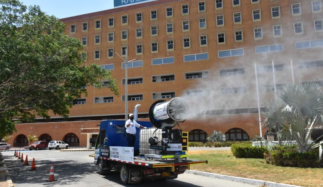 El Hospital Universitario ‘Julio Méndez Barreneche’, ubicado en Santa Marta, realiza un proceso de desinfección de la fachada del centro médico y sus alrededores, en aras de descontaminar el sector de posibles focos del COVID-19 o cualquier otro virus o bacteria.