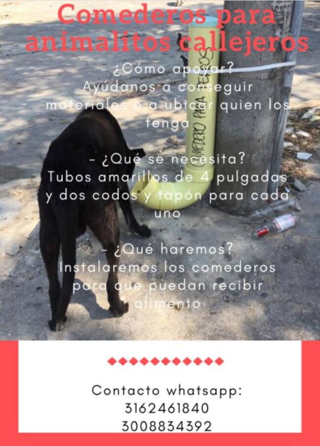 Ya hay 14 comederos para animales en varios sectores de Barranquilla hechos con tubos amarillo de cuatro pulgadas con sus respectivos codos y tapones que son amarrados a postes para que los vecinos les brinden frecuentemente comida a estos animales en condición de calle
