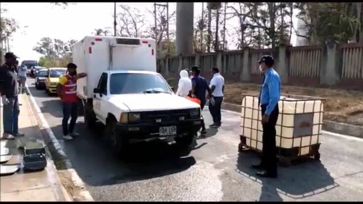 El puesto de control fue instalado en la entrada al corregimiento de Pasacaballos, donde uno a uno pasaron los carros y fueron rociados por un químico que desactiva los alcalde del virus.