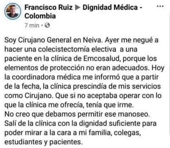 El médico cirujano Francisco Ruiz asegura que se negó a practicar una operación si no le brindaban los recursos para ejercer su trabajo, situación que motivó a las directivas de la clínica Emcosalud de Neiva a presidir de sus servicios.