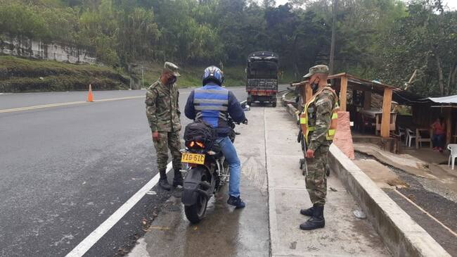 Soldados verifican en la vía La Línea el cumplimiento del aislamiento obligatorio / Cortesía Octava Brigada Ejército