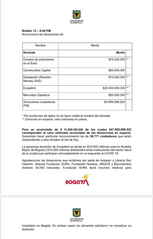 Alcaldía de Bogotá recaudó más de $51.000 millones durante la “donatón”