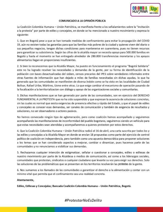 De otro lado, la personera de Bogotá, Rosalba Cabrales Romero, le solicitó a la Administración Distrital que le entregue la información concreta con los nombres de los ediles y demás servidores públicos que puedan estar involucrados en la promoción de protestaspor falta de ayudas a las comunidades, en busca de réditos políticos.