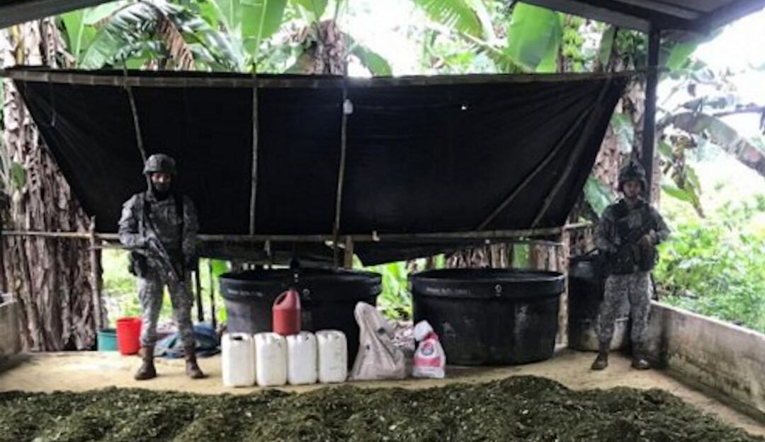 En la zona se hallaron 4 laboratorios, 792 kilos de insumos sólidos, 1050 kilos de hoja de coca y 133 galones de insumos líquidos, utilizados para el procesamiento ilícito de estupefacientes.
