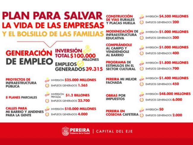 Como una medida para superar la grave crisis económica por la que atraviesan las empresas pereiranas, el mandatario local, Carlos Maya, anunció que se dispusieron 20 mil millones de pesos para prestarles a quienes tienen medianas y grandes organizaciones y viven en la capital risaraldense. Asimismo, se tiene una bolsa de 5.000 millones de pesos para dar capital semilla a los emprendedores y microempresarios y a los que tengan deudas, la Alcaldía les comprará las carteras con los bancos.