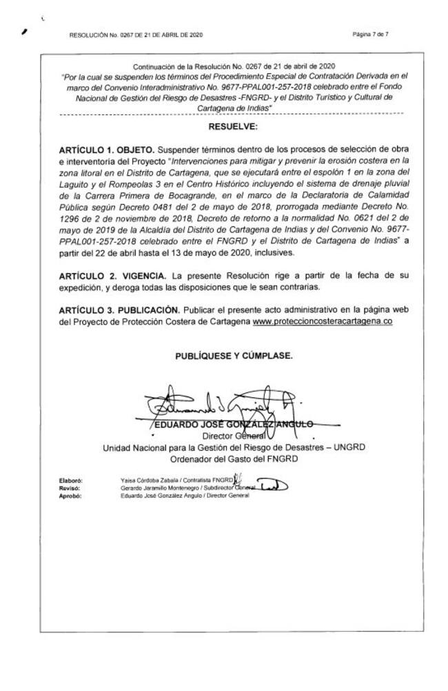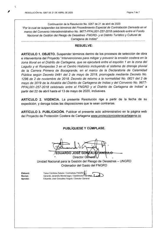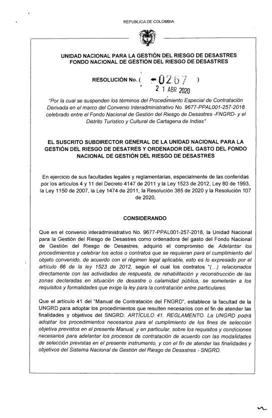De tal manera se expidió la Resolución 0267 del 21 de abril de 2020 "Por la cual se suspenden los términos del Procedimiento Especial de Contratación Derivada en el marco del Convenio Interadministrativo No. 9677-PPAL001-257-2018 celebrado entre el Fondo Nacional de Gestión del Riesgo de Desastres - FNGRD- y el Distrito Turístico y Cultural de Cartagena", la cual ya está publicada y podrá ser consultada en la página: https://proteccioncosteracartagena.co/
