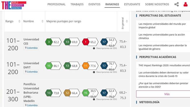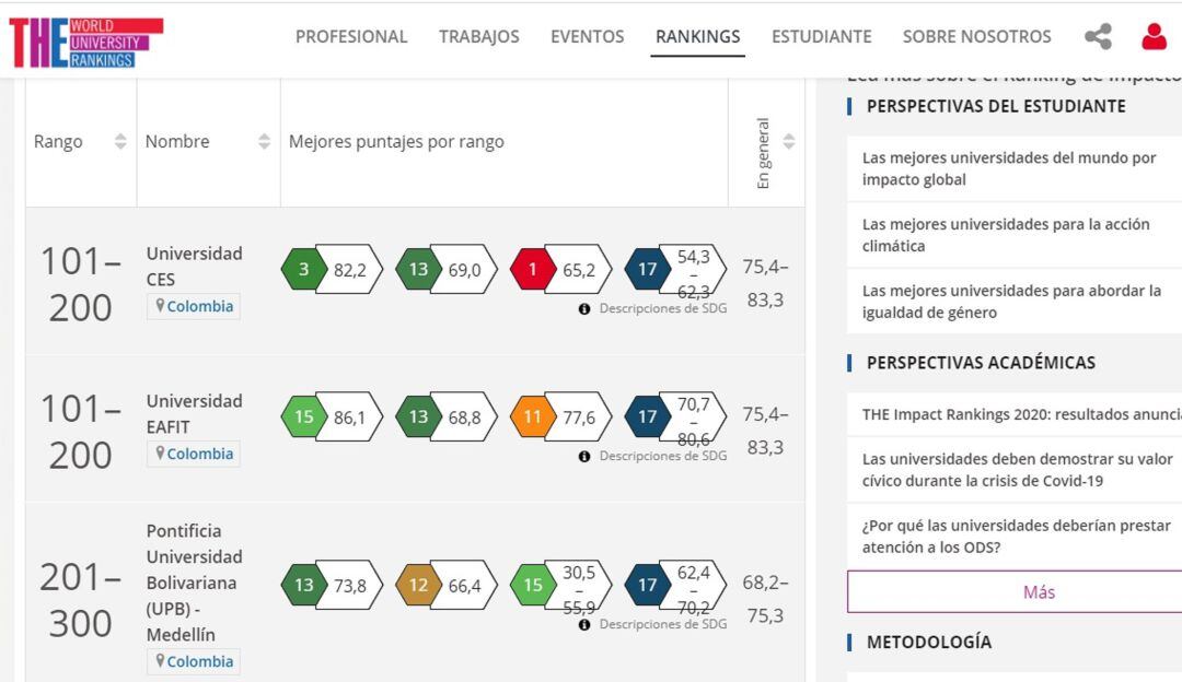 Las universidades CES y Eafit, obtuvieron un empate técnico en el primer lugar, quienes se ubicaron en el grupo 101-200 en el ranking de la edición 2020, el cual mide el desempeño de las universidades del mundo frente a los ODS de las Naciones Unidas.