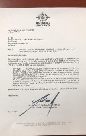 La Procuraduría Provincial de Armenia tomó la decisión de suspender por el término de tres meses al alcalde de Calarcá, Luis Alberto Balsero Contreras y a su secretario administrativo José Winser Garzón Tobaria, por irregularidades en la contratación de mercados en el marco de la emergencia por el COVID-19.