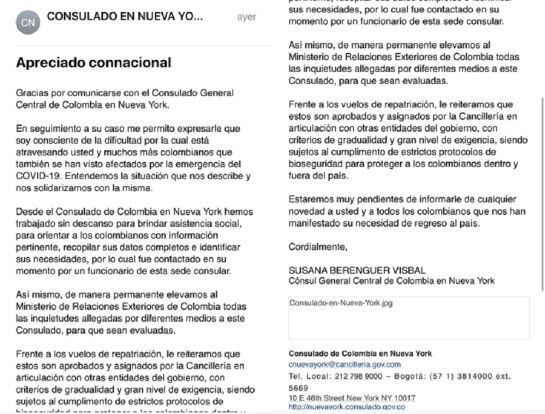 Respuesta que recibió del Consulado General Central de Colombia en Nueva York / Lina María Quintero