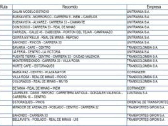 Nelly Patricia Marín Rodríguez, Subdirectora de Transporte encargada del Área Metropolitana indicó a Caracol Radio que las franjas horarias contempladas para la operación de las 34 rutas del transporte público colectivo estarán entre 5:00 a.m. a 7:30 a.m., de 11:30 a.m. a 1:30 p.m. y entre las 5:30 p.m. y las 7:30 p.m.