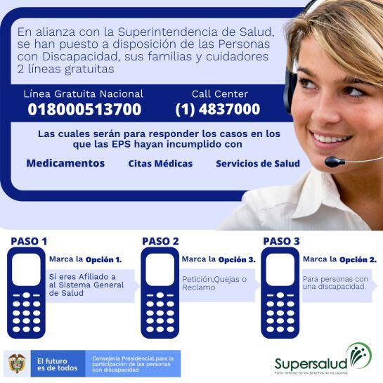Frente a las dificultades actuales e inmediatas de esta población, indicó que han dispuesto de dos líneas gratuitas, la 018000 513700 y la (1) 4837000, para que cuidadores y discapacitados puedan agilizar sus requerimientos en temas de salud, así como también del correo electrónico casosdiscapacidad@presidencia.gov.co para la población con discapacidad que no está incluida en los programas del gobierno.