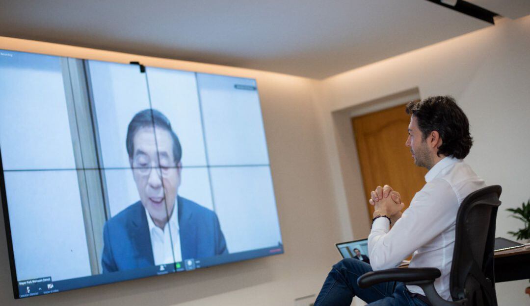 El miércoles 29 de abril el alcalde de Medellín, Daniel Quintero, participó por teleconferencia en la primera sesión del Recovery Task Force del C40 Cities con Park Won-soon Alcalde de Seul, Corea del Sur compartiendo experienciasen el uso de tecnologías para enfrentar al Covid19 y planear la reactivación económica.