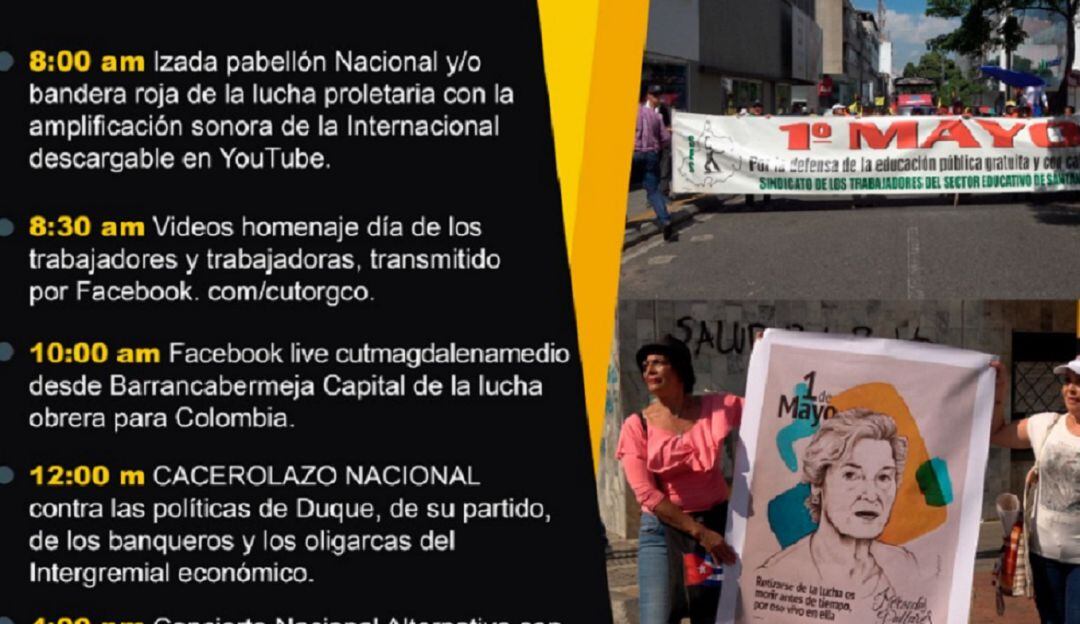 Wilson Ferrer de la Central Unitaria de Trabajadores, CUT, dijo que “en el 2020 no se realizarán grandes movilizaciones por las calles de Bucaramanga como es tradicional todos los primeros de mayo, pero por la pandemia de coronavirus, no hay razón para que los trabajadores no se movilicen, pero esta vez la protesta será por la redes sociales y a nivel mundial.