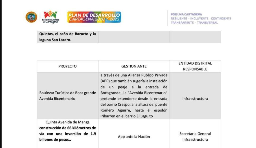 “A través de una Alianza Público Privada (APP) que también sugería la instalación de un peaje a la entrada de Bocagrande a ‘Avenida Bicentenario’ pretende extenderse desde la entrada del barrio Crespo, a la altura del puente Romero Aguirre, hasta el espolón Iribarren en el barrio El Laguito”, dice en la página 300 del Plan de Desarrollo ‘Salvemos Juntos a Cartagena’.