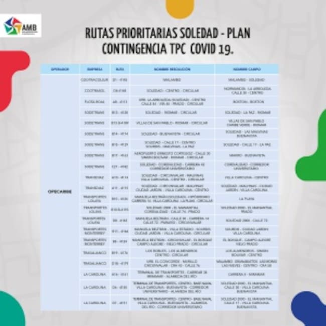 Ante la suspensión indefinida de Transmetro, el Área Metropolitana de Barranquilla (AMB) dio a conocer las 49 rutas que permitirán conectar a Barranquilla y Soledad y viceversa, para evitar dificultades en la movilización de los usuarios que hacen parte de las excepciones.