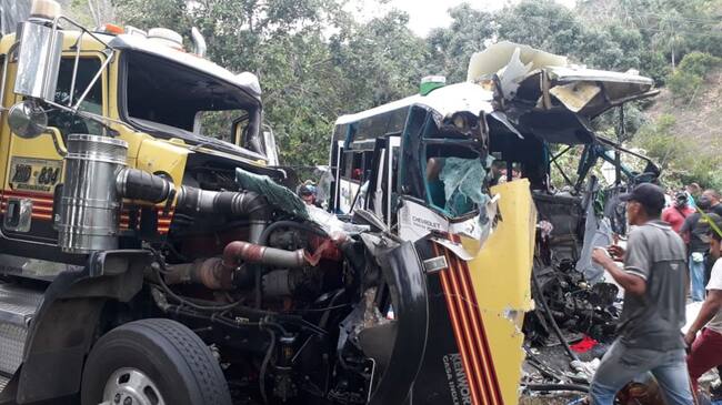 De acuerdo al reporte de las autoridades, un bus afiliado a la empresa Cootranoriente, movilizaba cerca de 40 personas en la tarde de este martes y al invadir el carril contrario chocó contra una tractomula, dejando dos muertos y 29 heridos.