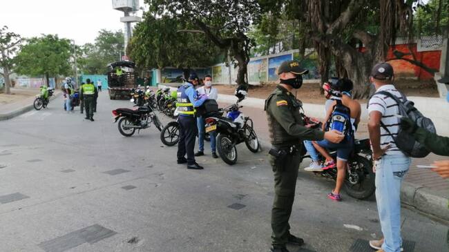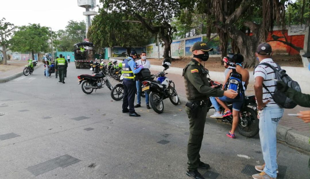 Para regular el comportamiento ciudadano, previniendo la propagación del riesgo sanitario al Covid 19, la Policía Metropolitana de Cartagena, junto al Departamento de Tránsito y Transporte – DATT, han desplegado una estrategia conjunta para verificar la circulación de personas, a bordo de motocicletas y vehículos particulares y de servicio público, en toda la ciudad, en puestos de control móviles, ubicados en vías principales y secundarias.