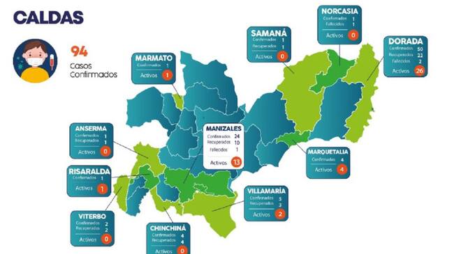Caldas tiene 94 casos positivos de Coronavirus y registra 4 personas fallecidas oriundas de La Dorada (2), Manizales (1) y Norcasia (1).