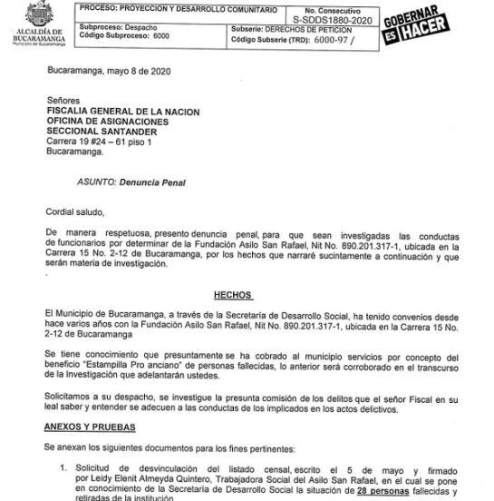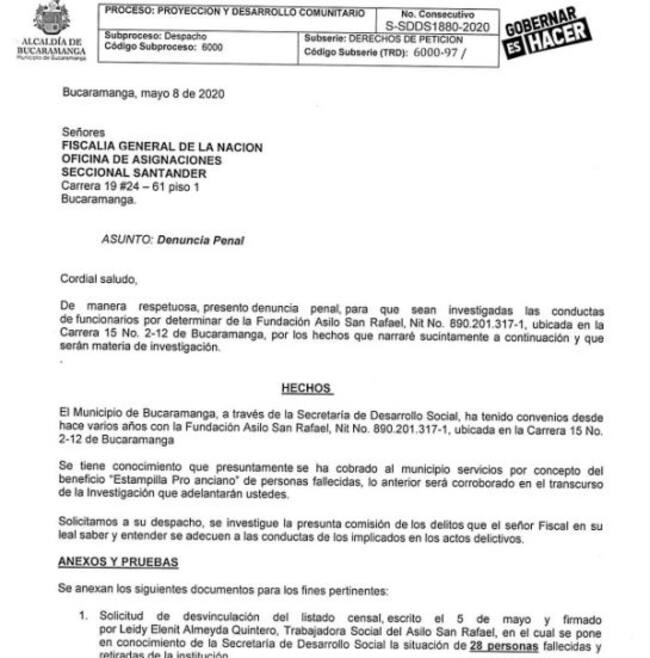 El alcalde de Bucaramanga, Juan Carlos Cárdenas confirmó la supuesta utilización irregular de dineros girados a asilos como el San Rafael para la atención de adultos mayores en estado de desprotección.