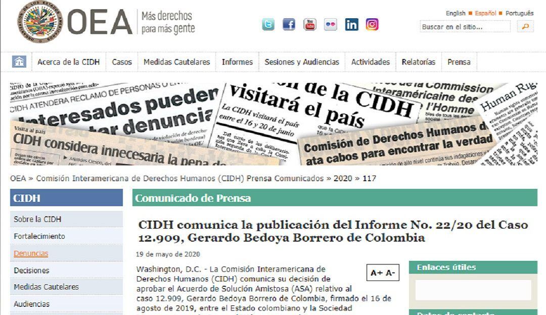 La Comisión Interamericana de Derechos Humanos, aprobó el Acuerdo de Reparación, entre el estado colombiano y la Sociedad Interamericana de Prensa, SIP, después de alegar la responsabilidad internacional de Colombia en el homicidio del periodista y columnista Gerardo Bedoya Borrero ocurrido en Cali el 21 de marzo de 1997.