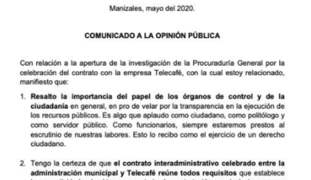 El secretario general de la Alcaldía de Manizales Juan Camilo Arroyave se pronunció sobre la investigación que se le abrirá por parte de la Procuraduría General de la Nación por la celebración de un contrato por 470 millones de pesos con el canal regional Telecafé.